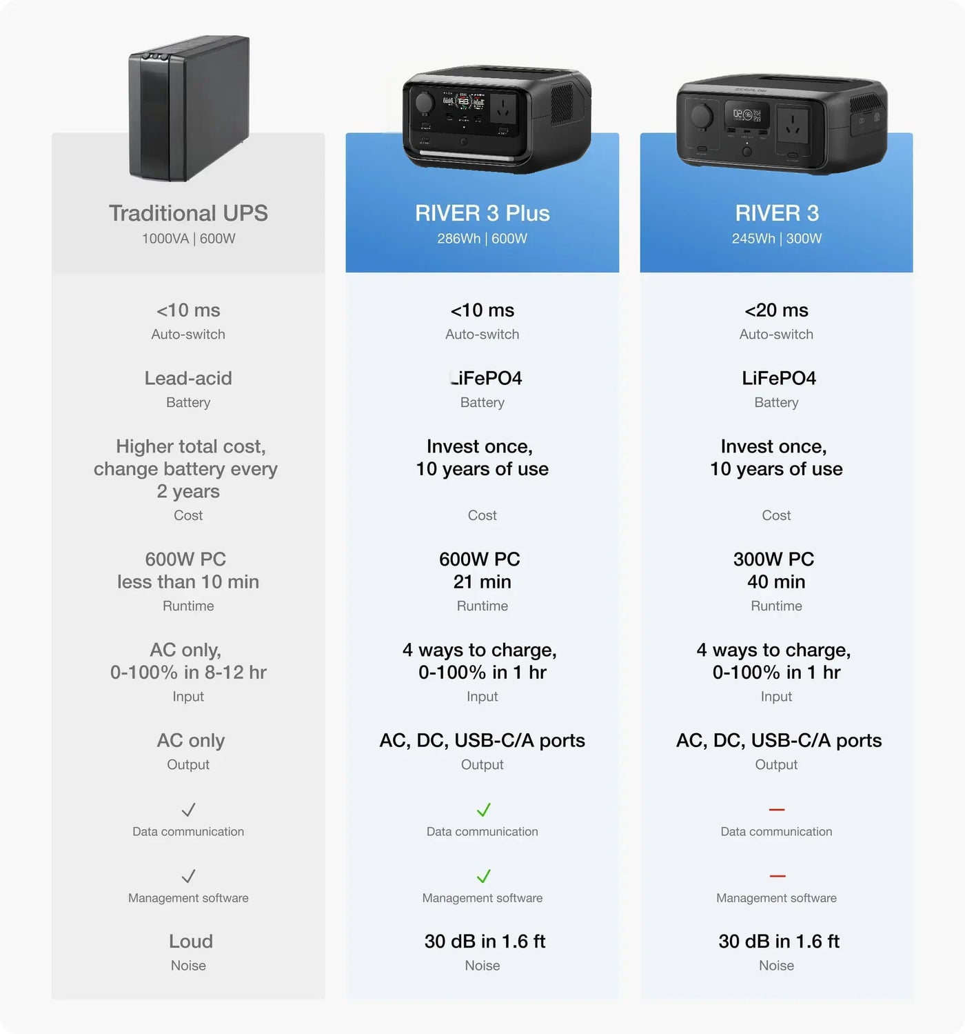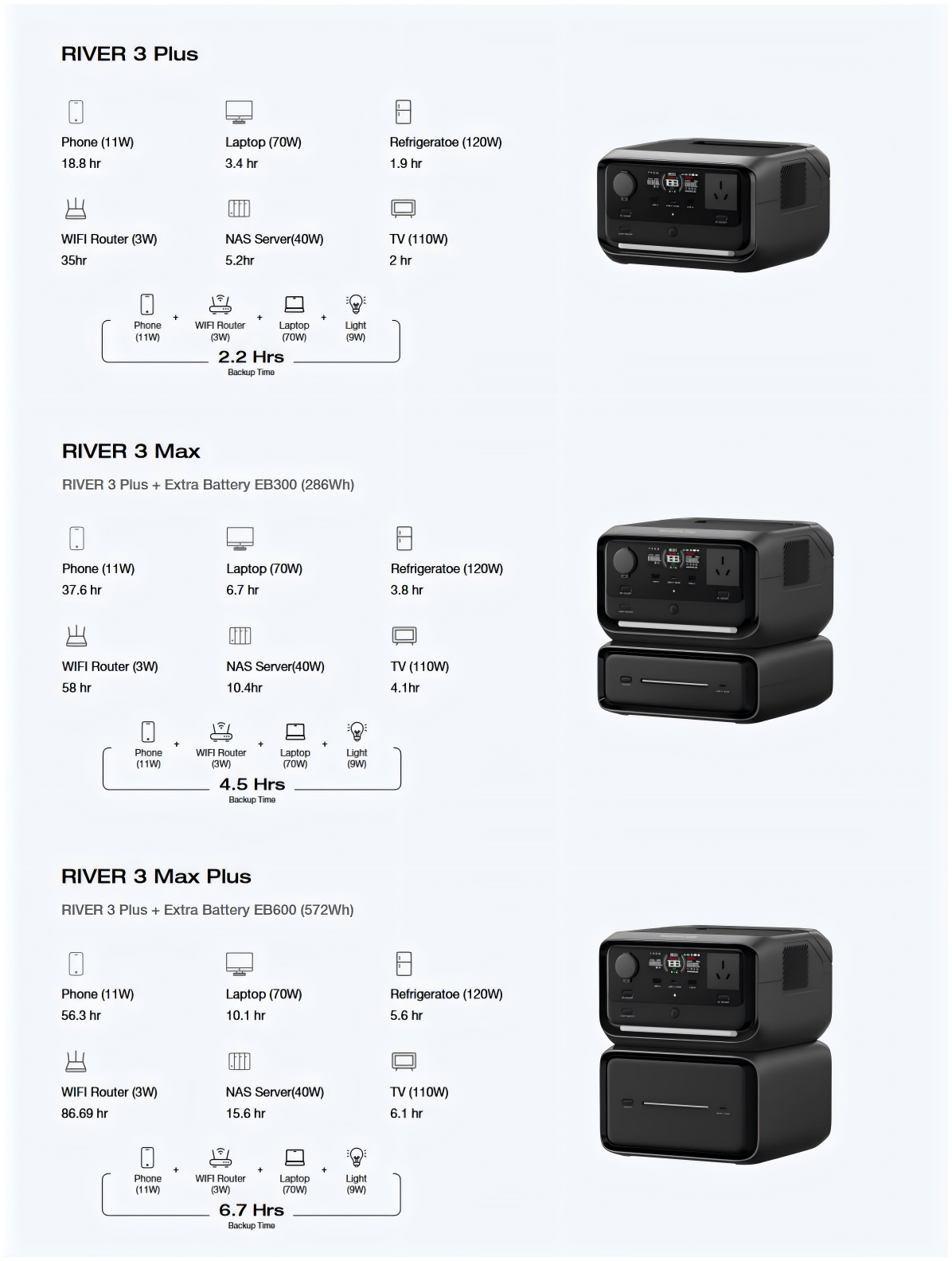 Level up your power with RIVER 3 Plus with an Extra Battery. RIVER 3 Plus can handle either the EB300 (286Wh) or the EB600 (572Wh), Just stack them to get up to 858Wh of pure energy.